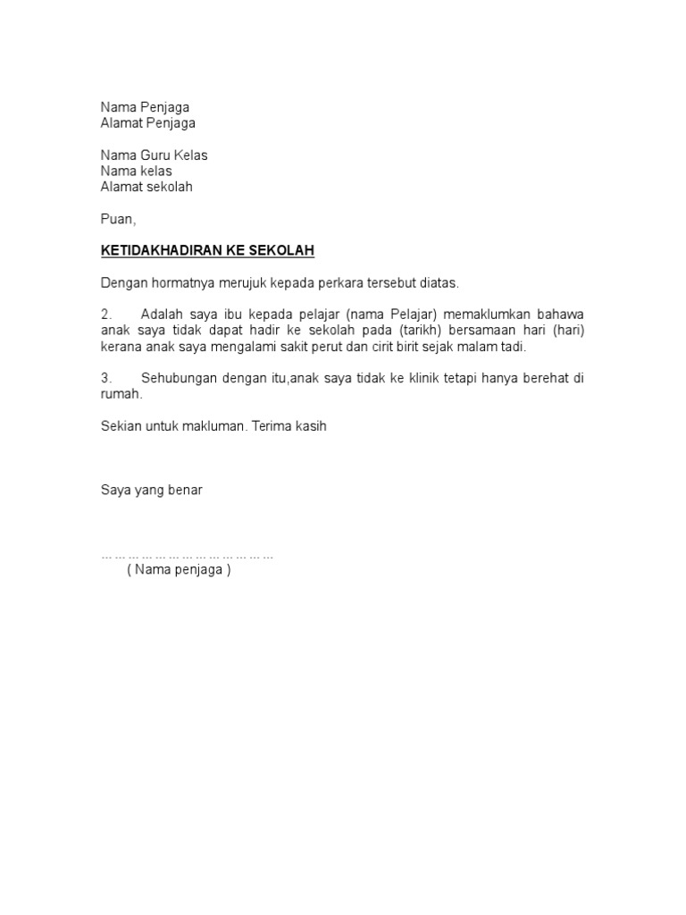 Maka boleh gunakan contoh surat tidak hadir ke sekolah kerana sakit ini. _____ general manager sas hotel 26080 kuantan. Surat Rasmi Tidak Hadir.